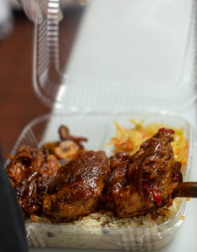 Your chicken will be on a bed of rice or rice and peas with a choice of two sides that we offer.