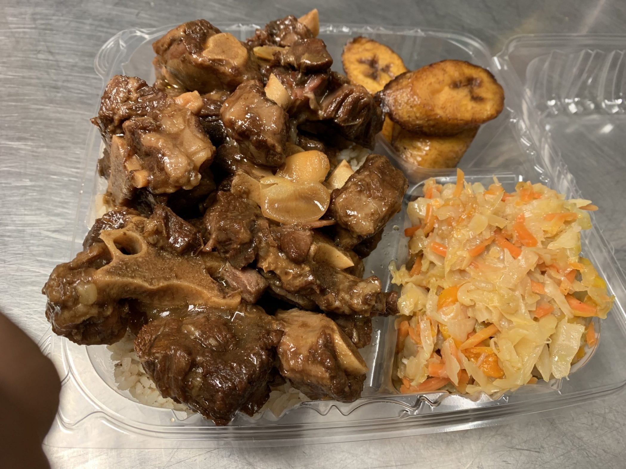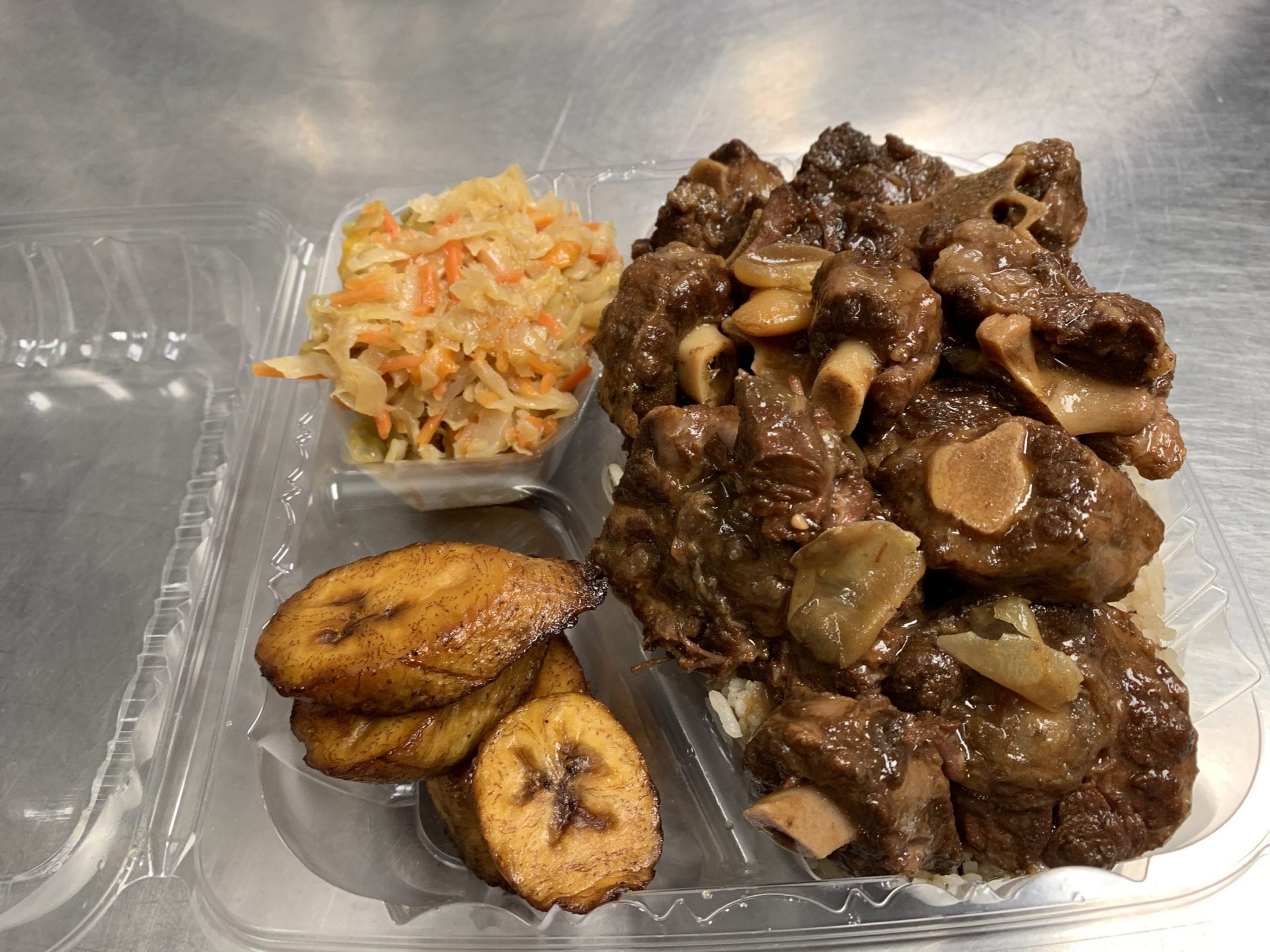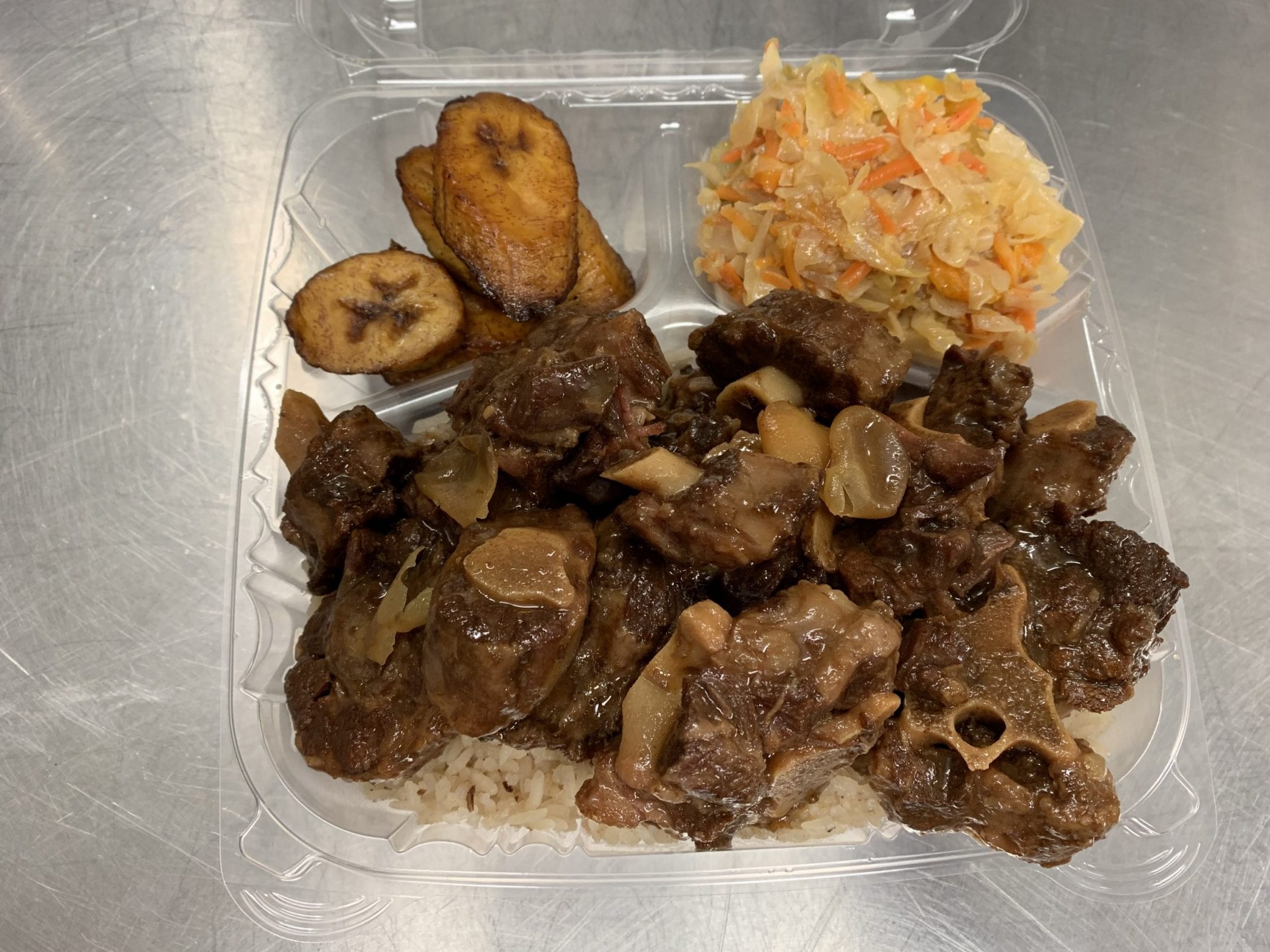 Oxtail is a-rich meat, slow-cooked with butter bean as the main dish (with rice) most popular in, Jamaica, and other West Indian cultures. Our oxtails are rich with flavor, perfectly cooked until the meat nearly fall-off-the-bone with creamy butter beans. Our flavors come from onions, scallions, fresh thyme, allspice, and garlic.