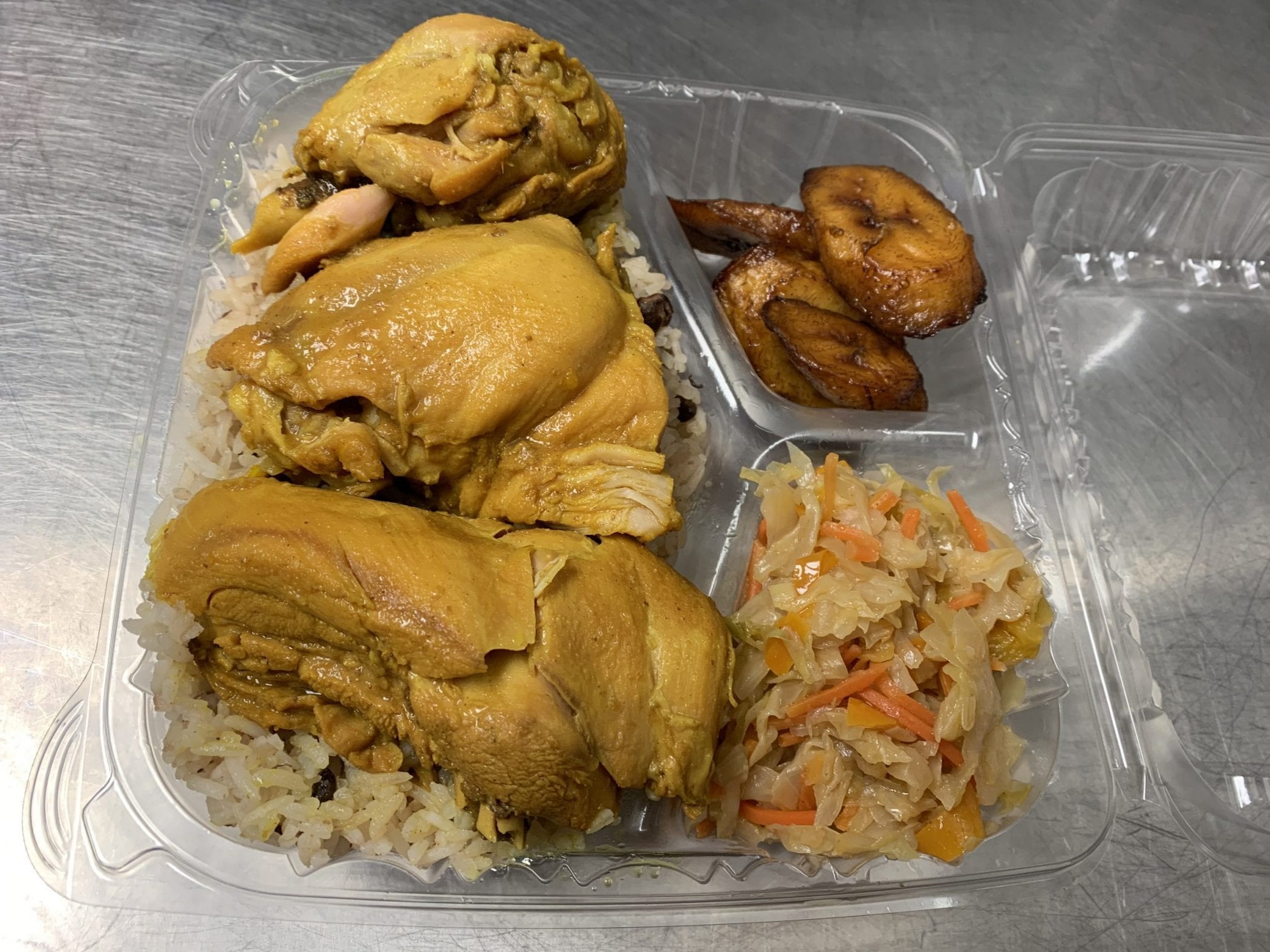 Your chicken will be on a bed of rice or rice and peas with a choice of two sides that we offer.